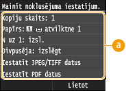 Noklusējuma iestatījumi ir tie iestatījumi, kas tiek parādīti ikreiz, kad ieslēdzat iekārtu vai nospiežat