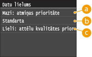 Skenētie dokumenti tiek konvertēti norādītajos failu formātos. Šajā brīdī varat norādīt faila saspiešanas koeficientu. <Mazi: atmiņas prioritāte> padara saspiešanas koeficientu augstāku nekā parasti, lai izveidotu mazākus failus ar zemāku attēla kvalitāti. Savukārt <Lieli: attēlu kvalitātes prioritāte> padara saspiešanas koeficientu zemāku nekā parasti, lai izveidotu lielākus failus ar augstāku attēla kvalitāti.