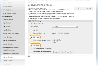 Iekārta un autentifikācijas serveris veic savstarpēju autentifikāciju, pārbaudot sertifikātus. Sertificēšanas iestādes (Certification Authority — CA) izsniegtais atslēgu pāris ir nepieciešams, lai autentificētu klientu (autentificējot iekārtu). Lai autentificētu serveri, papildus iekārtā sākotnēji instalētajam CA sertifikātam var izmantot to CA sertifikātu, kas tika instalēts, izmantojot Remote UI (Attālais lietotāja interfeiss). TLS metodi nevar vienlaikus izmantot ar TTLS vai PEAP.