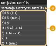 Galite padidinti arba sumažinti kopijas naudodami iš anksto nustatytą kopijavimo mastelį, pvz., <A5->A4>, arba nustatyti pasirinktinį kopijavimo mastelį 1 % žingsniais.
