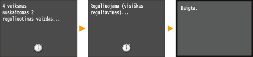 Šis koregavimas išlaiko optimalią būseną, kuri buvo pasiekta atliekant <Visiškas reguliavimas>. Atkreipkite dėmesį, kad šio koregavimo negalėsite atlikti, kol atliekamos kai kurios funkcijos, įskaitant nuskaitymą ir spausdinimą. Jei šio koregavimo rezultatas netenkina, atlikite <Visiškas reguliavimas>. Šis koregavimas gali būti atliekamas automatiškai, kai pakeičiate kasetę.