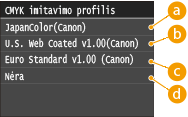 Pasirinkus ne <Nėra>, o kitą nustatymą, ir aparatui gavus nuo prietaiso priklausančią spalvų erdvės apibrėžimą, kurio spalvas apdoroja pagrindinis kompiuteris, aparatas taip pat pritaiko <CMYK imitavimo profilis>.