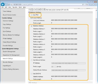 Aparato IPv6 adresus galima sukonfigūruoti naudojant priemonę „Remote UI“ (Nuotolinio vartotojo sąsaja). Prieš nustatydami IPv6 adresus, patikrinkite IPv4 adreso parametrus (IPv4 parametrų peržiūra). Kad galėtumėte naudoti IPv6 adresus, turite nustatyti tinkamus IPv4 parametrus. Atkreipkite dėmesį, kad IPv6 aplinkoje nėra nuskaitymo funkcijos, kuri naudoja skaitytuvo tvarkyklę arba „MF Scan Utility“. Įrenginyje gali būti naudojami daugiausiai devyni toliau nurodyti IPv6 adresai: