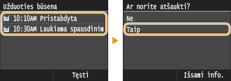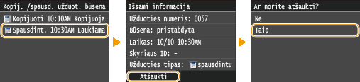 Atšaukiama iš „Remote UI“ (Nuotolinio vartotojo sąsaja) priemonėsSpausdinimą galite atšaukti iš „Remote UI“ (Nuotolinio vartotojo sąsaja) puslapio [Job Status]: Spausdinamų dokumentų esamos būsenos tikrinimas