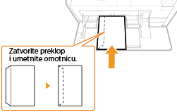 U ovom se odjeljku opisuje umetanje omotnica u željenom usmjerenju, kao i postupci koje je potrebno dovršiti prije umetanja omotnica. Opis općenitog postupka umetanja omotnica u ladicu za papir ili utor za ručno ulaganje potražite u odjeljcima Umetanje papira u ladicu za papir ili Umetanje papira u utor za ručno ulaganje.