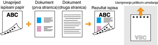 U ovom se odjeljku većim dijelom opisuje umetanje već ispisanog papira s pravilno okrenutom stranom i usmjerenjem. Opis općenitog postupka umetanja papira u ladicu za papir ili utor za ručno ulaganje potražite u odjeljcima Umetanje papira u ladicu za papir ili Umetanje papira u utor za ručno ulaganje.