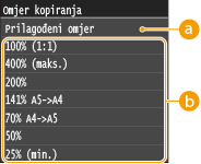 Kopije možete povećati ili smanjiti pomoću unaprijed postavljenih omjera kopiranja, kao što je <A5->A4>, ili postavljanjem prilagođenog omjera kopiranja u koracima od 1 %.