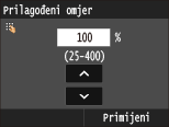ili pomoću numeričkih tipki, a zatim dodirnite <Primijeni>. Možete postaviti bilo koji omjer kopiranja od 25 % do 400 % u koracima od 1 %.