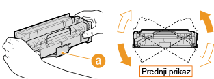 Protresite spremnik tonera pet ili šest puta kao što je prikazano da bi se toner ravnomjerno rasporedio unutar spremnika, a zatim ga položite na ravnu površinu.
