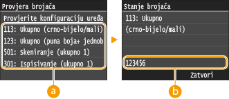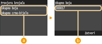 Možete zasebno provjeriti ukupan broj stranica za ispise u boji i crno-bijele ispise. Osim kopija i ispisa podataka s računala, ti ukupni iznosi obuhvaćaju faksove, izvješća i popise.