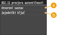 Prilikom povezivanja s bežičnim LAN-om u uređaju će se pojaviti pogreška provjere autentičnosti ako je na bežičnom usmjerivaču postavljena provjera autentičnosti putem zajedničkog ključa. Ako se to dogodi, uređaj će automatski promijeniti postavku u <Zajednički ključ> i ponovno pokušati uspostaviti vezu.