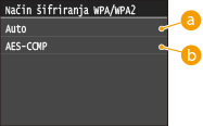 ![]() <Auto>Postavlja uređaj da automatski odabire AES-CCMP ili TKIP koji odgovara postavkama bežičnog usmjerivača.