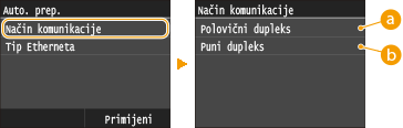 , dodirnite <Polovični dupleks> ili <Puni dupleks>.![]() <Polovični dupleks>Naizmjenično šalje i prima podatke za komunikaciju. Odaberite kada je uređaj povezan s mrežnim uređajem putem naizmjeničnog dvosmjernog načina komunikacije.