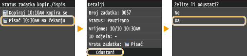 Otkazivanje iz sučelja Remote UI (Korisničko sučelje za daljinski pristup)Ispis možete otkazati sa stranice [Job Status] u sučelju Remote UI (Korisničko sučelje za daljinski pristup): Provjera trenutnog statusa dokumenata za ispis