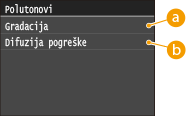 Možete odabrati način ispisa radi reprodukcije polutonova (srednji raspon između svjetlijih i tamnijih područja slike) radi postizanja optimalne kvalitete slike. Dodirnite <Gradacija> ili <Difuzija pogreške>.