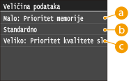 Skenirani se dokumenti pretvaraju u navedene formate zapisa datoteka. U tom trenutku možete odrediti omjer kompresije datoteke. <Malo: Prioritet memorije> povećava omjer kompresije u odnosu na uobičajeni radi stvaranja manjih datoteka s manjom kvalitetom slike. S druge strane, <Veliko: Prioritet kvalitete slike> smanjuje omjer kompresije u odnosu na uobičajeni radi stvaranja većih datoteka i veće kvalitete slike.
