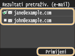 Dostupni kriteriji za pretraživanje odredišta su osobna imena, brojevi faksa, adrese e-pošte, nazivi tvrtki ili ustanova te nazivi organizacijskih jedinica. Istovremeno se može navesti više kriterija pretraživanja.