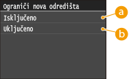Ograničavanjem brojeva koje je moguće navesti prilikom slanja dokumenata na one koji su registrirani u adresaru, koje ste već koristili ili koje je moguće tražiti na LDAP poslužiteljima smanjujete mogućnost navođenja netočnih odredišta i korisnicima onemogućujete odavanje informacija. Kada je ta funkcija omogućena, uređaj korisnicima zabranjuje unos odredišta pomoću numeričkih tipki, dodavanje novih unosa u adresar te uređivanje postojećih unosa u adresaru.