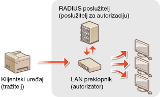 Uređaj se može povezivati s 802.1X mrežom kao klijentski uređaj. Uobičajena 802.1X mreža sastoji se od RADIUS poslužitelja (poslužitelj za autorizaciju), LAN preklopnika (autorizatora) i klijentskih uređaja sa softverom za provjeru autentičnosti (tražitelja). Ako se uređaj pokuša povezati s 802.1X mrežom, mora proći provjeru autentičnosti korisnika da bi se potvrdilo da se povezuje ovlašteni korisnik. Podaci o provjeri autentičnosti šalju se na RADIUS poslužitelj gdje se provjeravaju, nakon čega poslužitelj dopušta ili odbija komunikaciju s mrežom, u skladu s rezultatom provjere autentičnosti. Ako provjera autentičnosti ne uspije, LAN preklopnik (ili pristupna točka) blokira vanjski pristup mreži.