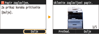 Ako se papir zaglavi, na zaslonu će se pojaviti poruka <Papir zaglavljen.>. Dodirnite <Dalje> da biste prikazali jednostavna rješenja. Ako vam je teško shvatiti postupke prikazane na zaslonu, informacije o uklanjanju zaglavljenja potražite u sljedećim odjeljcima.