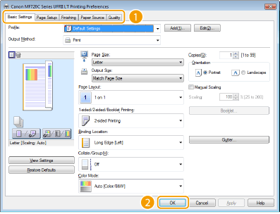 Kliknite zavihek [Basic Settings] (Osnovne nastavitve), [Page Setup] (Priprava strani), [Finishing] (Zaključevanje), [Paper Source] (Vir papirja) ali [Quality] (Kakovost) in po potrebi na vsakem zaslonu določite nastavitve.