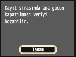 <Kaydediliyor... Ana gücü kapatmayın.> mesajı görüntülenirse bu seçeneği etkinleştirmek için gerekli işlevleri etkinleştirin ve lisans anahtarının aktivasyonunu yeniden sağlayın.