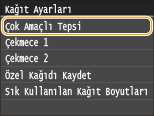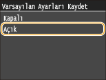 Varsayılan kağıt ayarı kaydedildikten sonra, kağıt yüklendiğinde kağıt ayarı ekranı görüntülenmez ve her zaman aynı ayar kullanılır. Kağıt ayarlarını değiştirmeden farklı bir kağıt boyutu veya türü yüklerseniz, makine düzgün yazdırmayabilir. Bu sorunu önlemek için, 3. adımda <Kapalı> seçeneğini belirleyerek varsayılan ayarı devre dışı bırakın ve ardından kağıdı yükleyin.