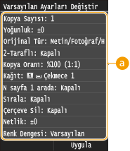 <Menü>  <Kopya Ayarları>  <Varsayılan Ayarları Değiştir>  Ayarı seçin  Seçilen öğenin varsayılan değerini değiştirin  <Uygula>