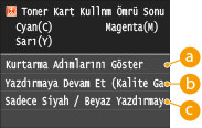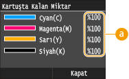 Bir toner kartuşunda kalan toner miktarına ilişkin görüntülenen bilgi, yalnızca bir kılavuz olarak kullanılabilir ve gerçekte kalan miktardan farklılık gösterebilir.