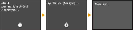 Bu ayar, renkli yazdırmaya yönelik üretilebilirliği en iyi hale getirir. Makine tam ayarlama gerçekleştirirken, renk üretilebilirliğini en iyi hale getirmek için bilgi alır. Makine, tam ayarlama gerçekleştirdiğiniz bir sonraki zamana kadar bu bilgileri korur. Tam ayarlama yapmak için, bir ayar resmi iki kez yazdırılır ve iki kez taranır. Tarama ve yazdırma dahil olmak üzere bazı işlevleri gerçekleştirirken bu ayarlamayı gerçekleştiremeyeceğinizi unutmayın.
