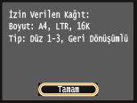 Ekranda görüntülenen kağıt boyutunun ve türünün makineye yüklenip yüklenmediğini kontrol edin ve <Tamam> tuşuna dokunun.