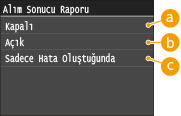 Alınan faks ve I-Faks belgelerinin günlüklerini bir Alım Sonucu Raporu yazdırarak denetleyebilirsiniz. Rapor, tamamlanan her iletimden sonra veya yalnızca alma hatası oluştuğunda yazdırılabilir.