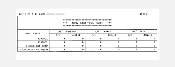 Departman Kimliği Yönetimi etkin olduğunda, her bir <Departman Kimliği> için toplam çıktı miktarını bir Departman Kimliği Yönetimi Raporu yazdırarak denetleyebilirsiniz. Çıktı toplamlarını denetleyerek kağıt ve toner kartuşu kaynaklarınızı daha iyi yönetebilirsiniz.