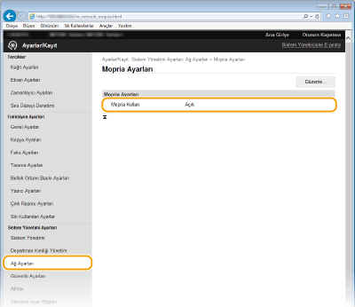 Sistem Yöneticisi Modunda Uzak Kullanıcı Arabirimi'nde oturum açın ( Uzak Kullanıcı Arabirimi'ni Başlatma)  [Ayarlar/Kayıt]  [Ağ Ayarları]  [Mopria Ayarları]  [Düzenle]  [Mopria Kullan] onay kutusunun işaretlendiğini kontrol edin  [Tamam]