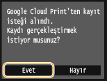 Bu makineyi bir mobil aygıttan ya da Google Chrome'dan da kaydettirebilirsiniz. Kayıt işlemi tamamlanmadan önce makinenin ekranında aşağıdaki onay ekranı görüntülenir. Kayıt işlemini tamamlamak için <Evet> öğesine dokunun.