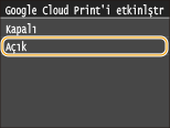 Makinenin Google Cloud Print işlevini etkinleştirin. Makinenin Google Cloud Print işlevini devre dışı da bırakabilirsiniz.