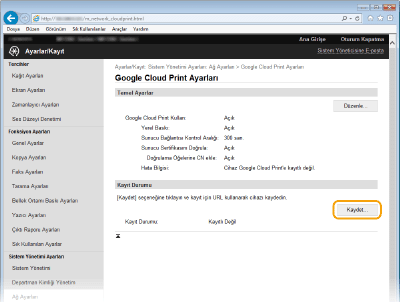 Google Cloud Print'i etkinleştirmeniz gerekir. [Düzenle] seçeneğini tıklatın, [Google Cloud Print Kullan] onay kutusunu seçin ve [Tamam] seçeneğini tıklatın.
