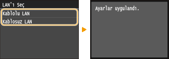 Makineyi bilgisayara bağlamak için kablolu veya kablosuz LAN üzerinde karar kıldıktan sonra, işletim panelini kullanarak kablolu LAN ya da kablosuz LAN'ı seçin. Ayarı <Kablolu LAN> öğesinden <Kablosuz LAN> öğesine (veya tam tersi) değiştirirseniz bilgisayarınızda yüklü MF Sürücülerini kaldırıp yeniden yüklemeniz gerekir. Ayrıntılar için bkz. MF Driver Installation Guide (MF Sürücü Kurulum Kılavuzu).