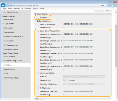 Makinenin IPv6 adresleri, Uzak Kullanıcı Arabirimi aracılığıyla yapılandırılabilir. IPv6 adreslerini ayarlamadan önce IPv4 adres ayarlarını denetleyin (IPv4 Ayarlarını Görüntüleme). IPv6 adreslerini kullanmak için doğru IPv4 ayarlarını ayarlamanız gerekir. Tarayıcı sürücüsünü veya MF Scan Utility'i kullanan tarama işlevinin bir IPv6 ortamında kullanılabilir olmadığını unutmayın. Makine, şu IPv6 adreslerinden en fazla dokuzunu kullanabilir: