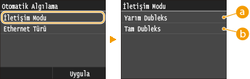 <Yarım Dubleks> veya <Tam Dubleks> öğesine dokunun.![]() <Yarım Dubleks>Sırayla iletişim verileri gönderir ve alır. Makine, yarı dupleks kullanarak bir ağ aygıtına bağlandığında seçin.