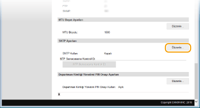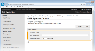 Basit Ağ Zamanı Protokolü (SNTP), ağ üzerindeki zaman sunucusunu kullanarak sistem saatini ayarlamanıza olanak sağlar. Bu protokol genellikle makinenin güvenlik kimlik doğrulaması etkinleştirilmiş bir LDAP sunucusuna erişmesi gerektiği durumlar gibi anlarda makine ile sunucuyu eşitlemek için kullanılır. Zaman, Eşgüdümlü Evrensel Saat (UTC) temel alınarak ayarlanır, bu nedenle SNTP'yi yapılandırmadan önce saat dilimi ayarını belirtin (Tarih/Saat Ayarları). SNTP ayarları, Uzak Kullanıcı Arabirimi aracılığıyla belirtilebilir.
