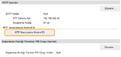[Ağ Ayarları] [TCP/IP Ayarları] öğesini ve ardından görünen [SNTP Ayarları] öğesindeki [NTP Sunucusunu Kontrol Et] öğesini tıklatarak kayıtlı sunucudaki iletişim durumunu görüntüleyebilirsiniz. Uygun bir bağlantı kurulduysa, aşağıda gösterildiği gibi sonuç görüntülenir. Bu işlemin, sistem saatini ayarlamadığını unutmayın.![]() |