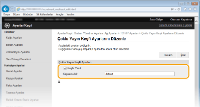 Makineyi, aygıt yönetim yazılımı çok noktaya yayın keşif paketlerine yanıt verecek şekilde ayarlamak ve aygıt yönetim yazılımı tarafından izlemeyi etkinleştirmek için onay kutusunu seçin. [Kapsam Adı]
