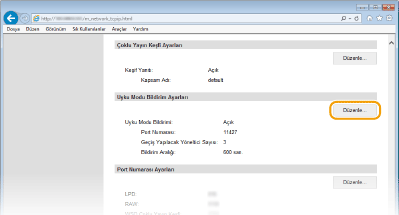 Aygıt yönetim yazılımına makinenin güç durumunu bildirmek için onay kutusunu seçin. [Bildir] seçildiğinde, makinenin uyku modundayken gereksiz iletişimi önlemesini ve toplam güç tüketiminin azaltılmasını bekleyebilirsiniz. [Port Numarası]