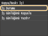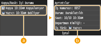 ![]() <Kopya/Baskı İşi Durumu>İşlenmekte olan, kopyalanmakta olan veya işlenmeyi bekleyen belgelerin bir listesini görüntüler.