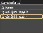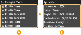![]() <İş Günlüğünü Yazdır>Yazdırılan belgelerin listesini görüntüler. <Tamam>, bir belge başarıyla yazdırıldığında görüntülenir ve <Hata>, bir belge iptal edildiği veya hata oluştuğu için belge yazdırılamadığında görüntülenir.