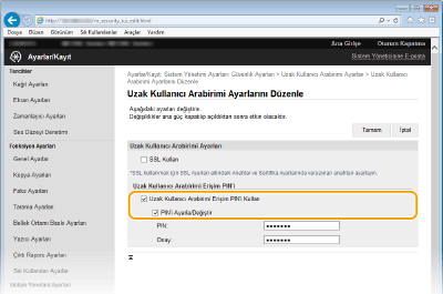 Uzak Kullanıcı Arabirimi ayarları başlangıç konumuna alınırsaUzak Kullanıcı Arabirimi PIN'i de başlangıç konumuna alınır. Başlangıç konumuna alındıktan sonra PIN'i sıfırlayın. Menüyü Başlangıç Durumuna Getirme