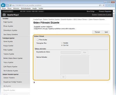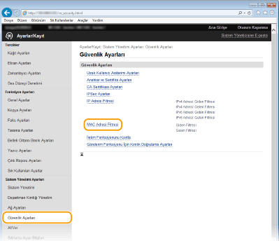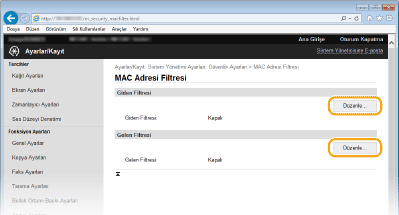 MAC adresleri yanlış şekilde girildiyse Uzak Kullanıcı Arabirimi'nden makineye erişemeyebilirsiniz ve bu durumda <MAC Adresi Filtresi> öğesini <Kapalı> olarak ayarlamanız gerekir. MAC Adresi Filtresi
