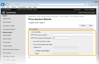 [Proxy Kullan] onay kutusunu seçin ve gerekli ayarları belirtin.