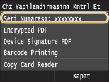 ![]() öğesinden seri numarasının kontrolü ( ) ( ) tuşuna basın ve <Cihaz Yapılandırmasını Kontrol Et> öğesine dokunun.![]() İşletim panelinden seri numarasının kontrolü